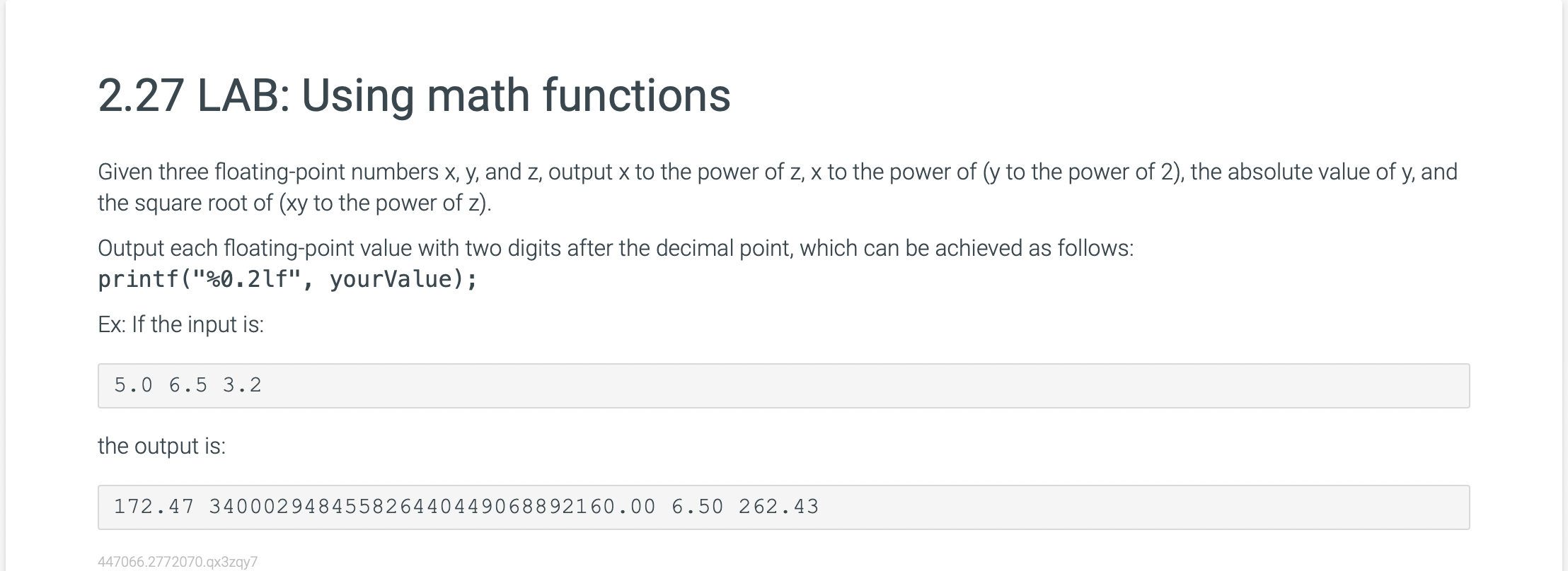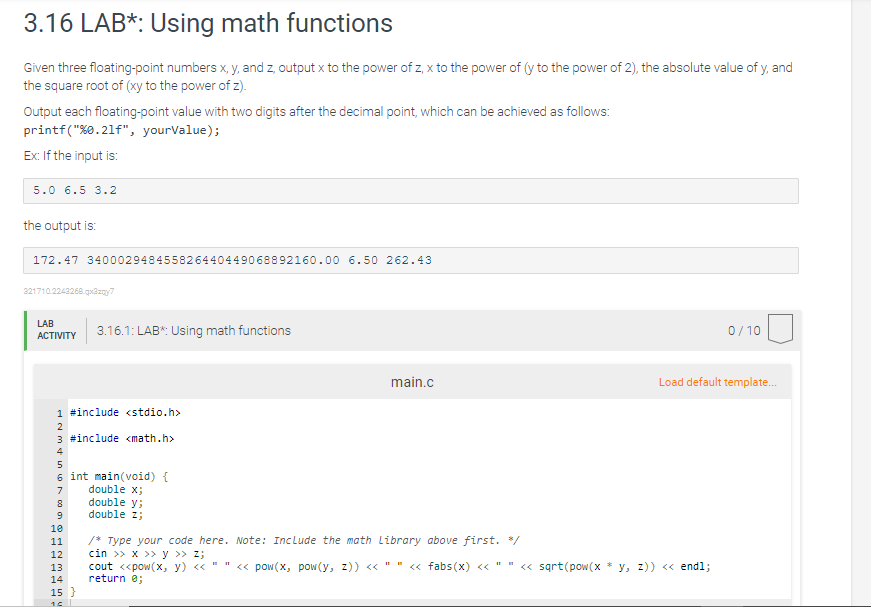 [Solved] I dont know what to do 2.16 LAB Using math functions Given