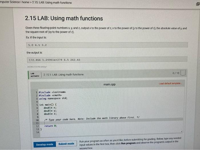 Solved mputer Science l home > 2.15 LAB Using math