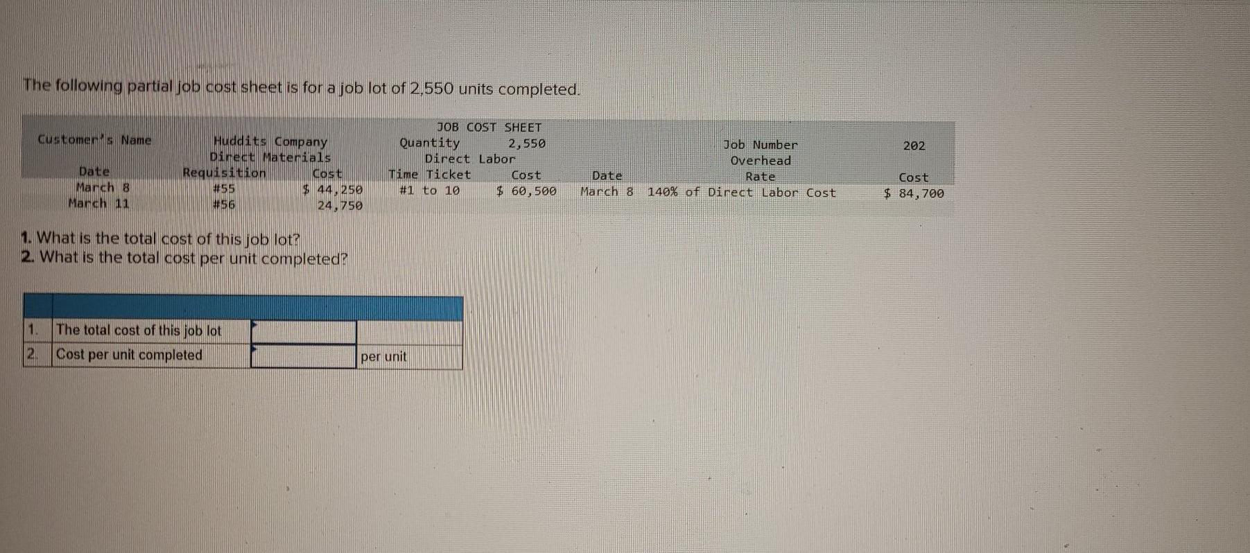 Solved The following partial job cost sheet is for a job lot