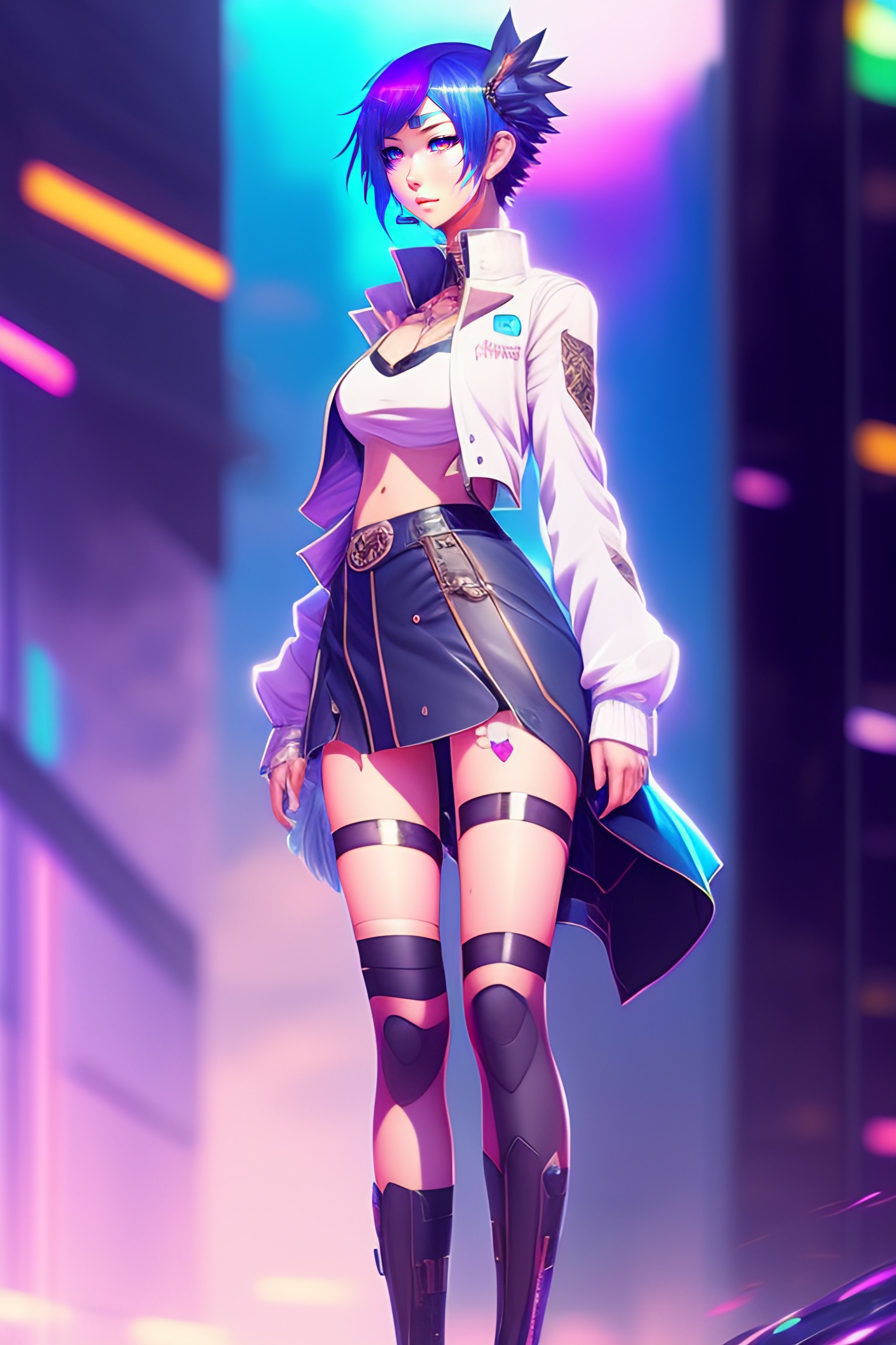 Lexica Anime cyberpunk woman with Pastel Rainbow white blue short