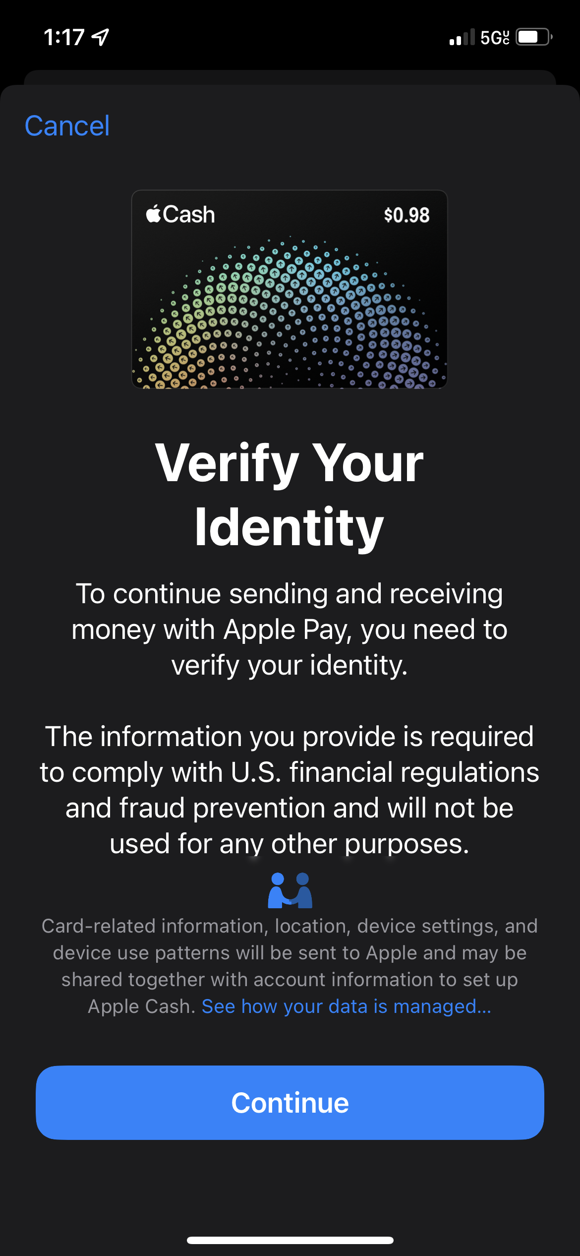 Open the settings app, tap wallet & apple pay, then tap your apple cash card. For steps that should help to verify your identity, check the section how to verify your identity for apple cash here: Sign back in to icloud, turn passcode. He said to transfer my balance to my bank account, leaving me with a zero balance in my apple cash account, and then try.
