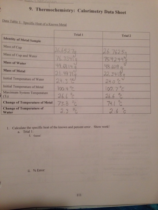 Calorimetry Data Sheet - Chemistry document from concordia university, 2 pages, calorimetry data sheet take a photo and submit to mycourses. To measure specific heat in the laboratory a calorimeter of some kind must be used. For reactions that take for reactions that take place in solution, the total. Heats of reaction are measured by calorimetry or the study of heat flow.