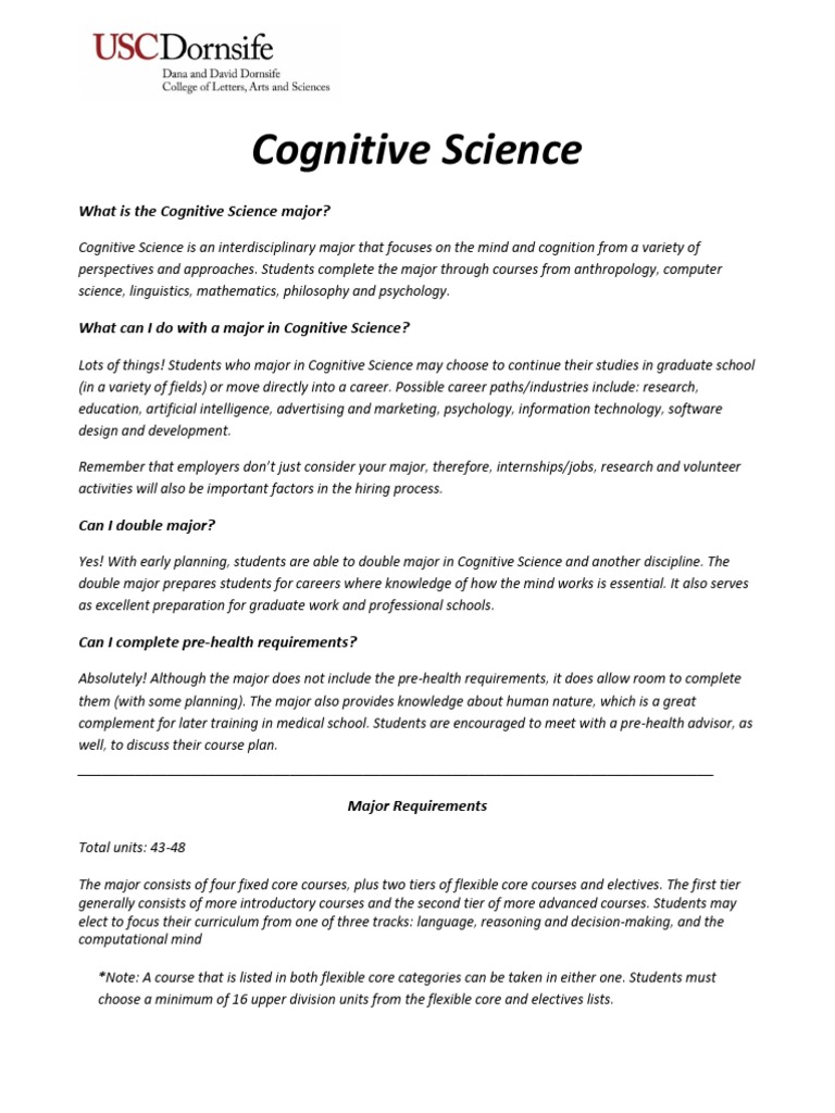Here's a link to the cog sci major requirements. You take at least one course from each of the five disciplines of cog sci: Associate professor of psychology, general faculty and director, cognitive science program Prospective majors must have completed and obtained grades of c+ or better in two designated cognitive science courses. One of the beautiful things about the.