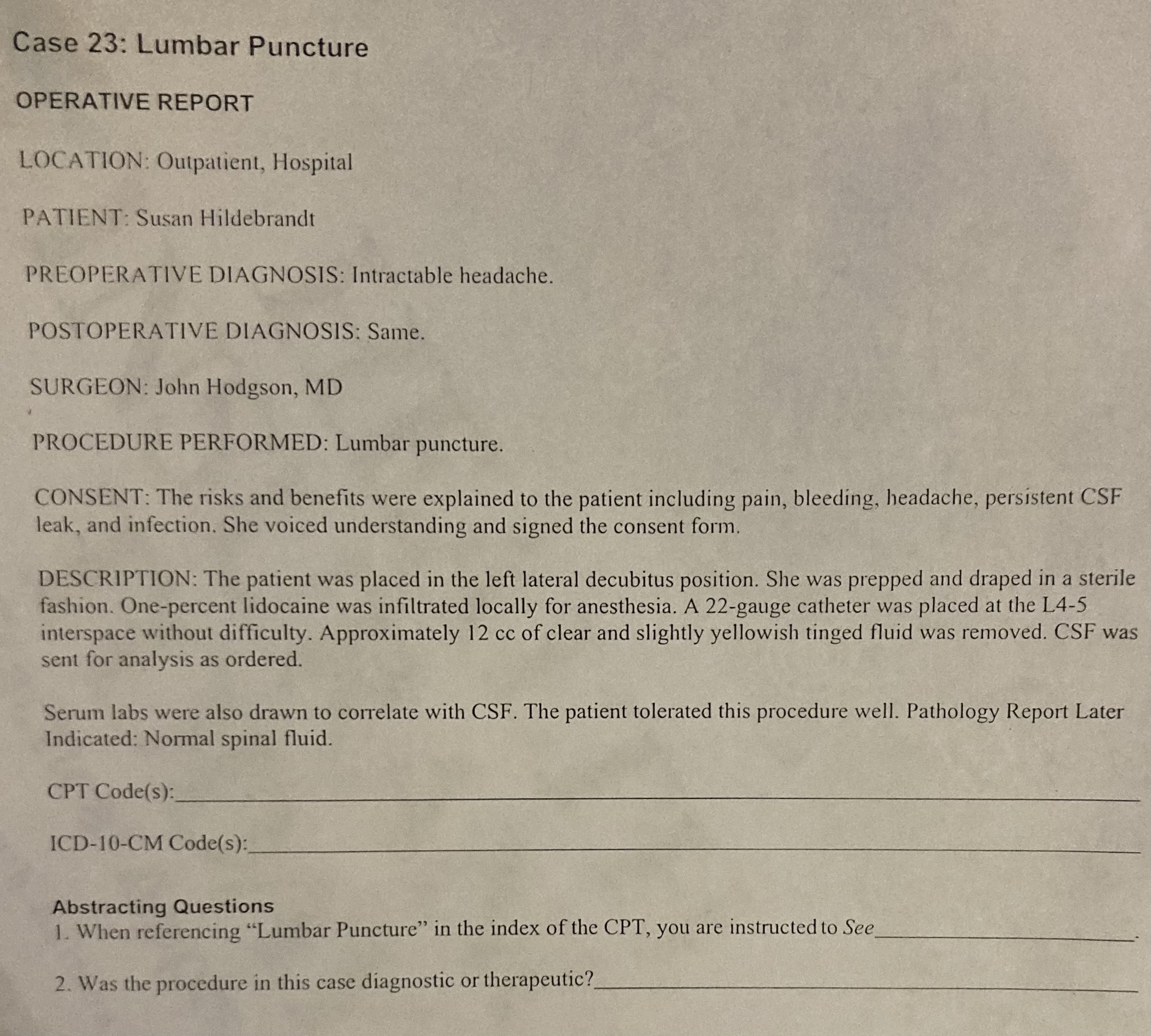 Solved Case 23 Lumbar Puncture OPERATIVE REPORT LOCATION
