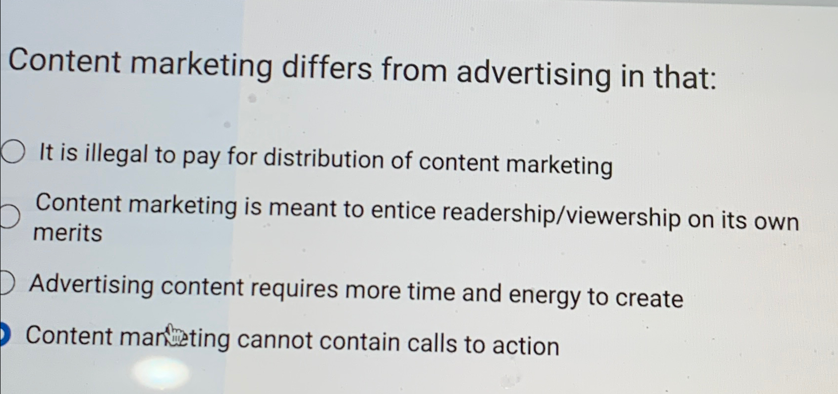 Study with quizlet and memorize flashcards containing terms like content marketing, content marketing differs from advertising in that, how. What is the difference between content marketing and advertising? Study with quizlet and memorize flashcards containing terms like what is content marketing?, how does content marketing differ from. The main difference between content marketing and advertising is that content marketing focuses.