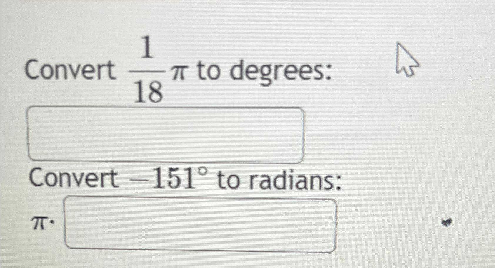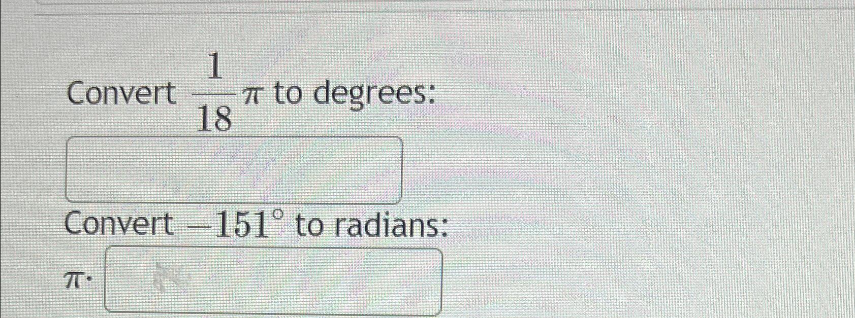 Convert 118π to degreesConvert 151° to radiansπ•