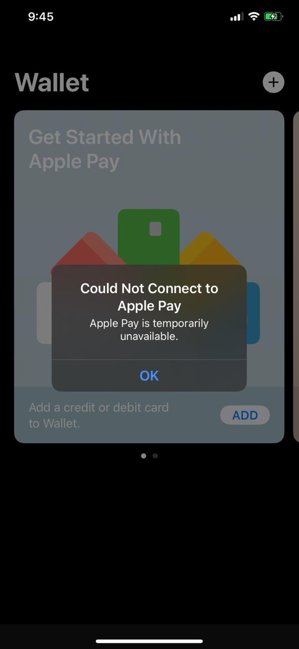 A user reports a problem with apple pay not working on mobile data and getting an alert saying could not connect to apple pay. Are you trying to use apple pay on your iphone or apple watch, but unable to connect? See possible solutions, such as. If you can't add a card to apple wallet to use with apple pay,.