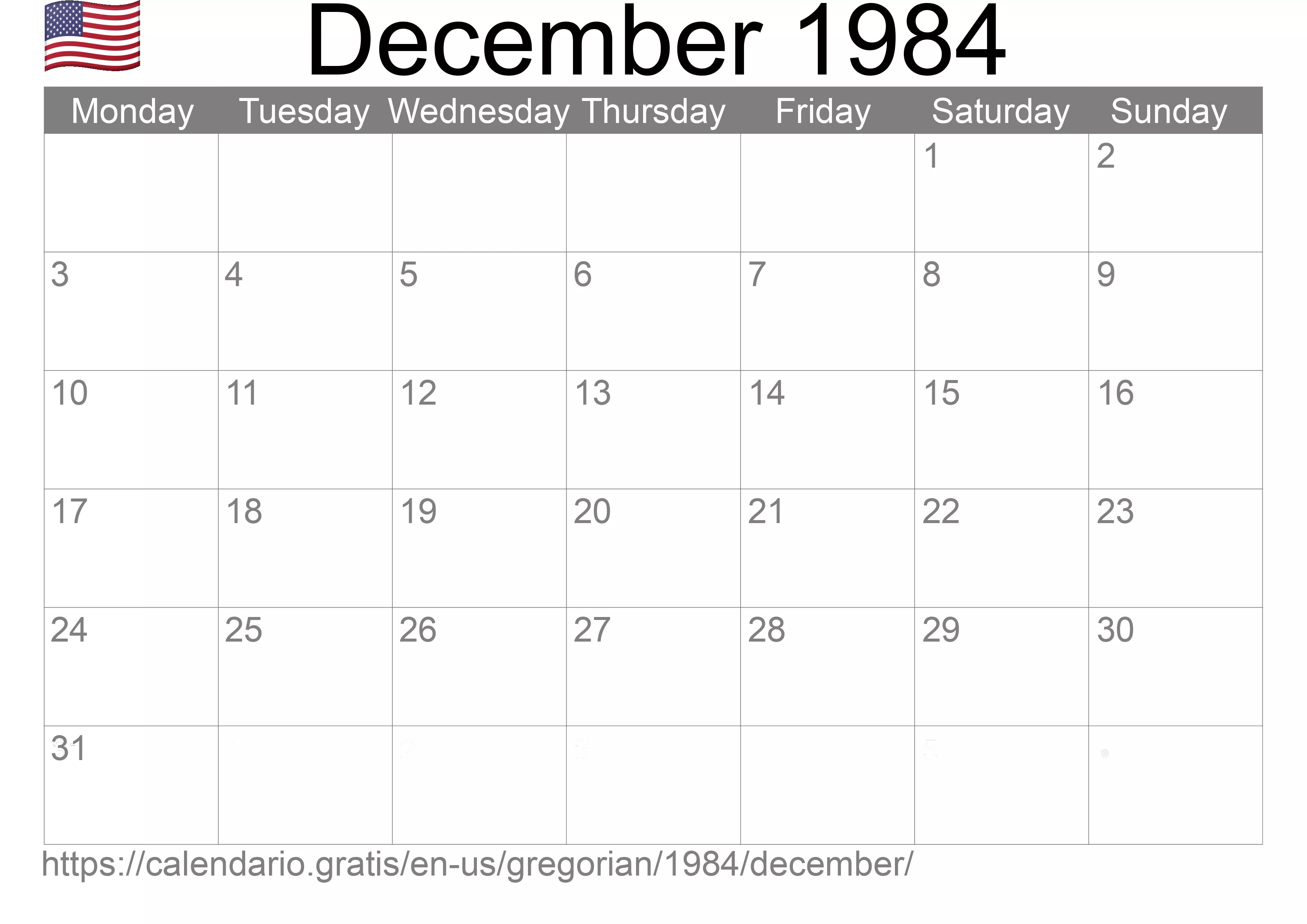 December 1984 has 20 work days. Free printable calendar for december 1984. Free december 1984 month calendar templates in pdf, word, and excel that are printable, downloadable, fillable, and editable. View online or print in pdf format. View the online 1984 calendar.