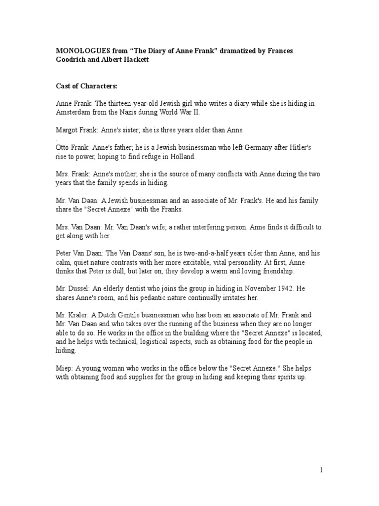 Monologue anne from the diary of anne frank adapted from frances goodrich and albert backett's dramatization of the diary of a. Diary of anne frank anne. Reviewing the diary of anne frank monologues: (she looks up through the skylight) what a lovely, lovely day!