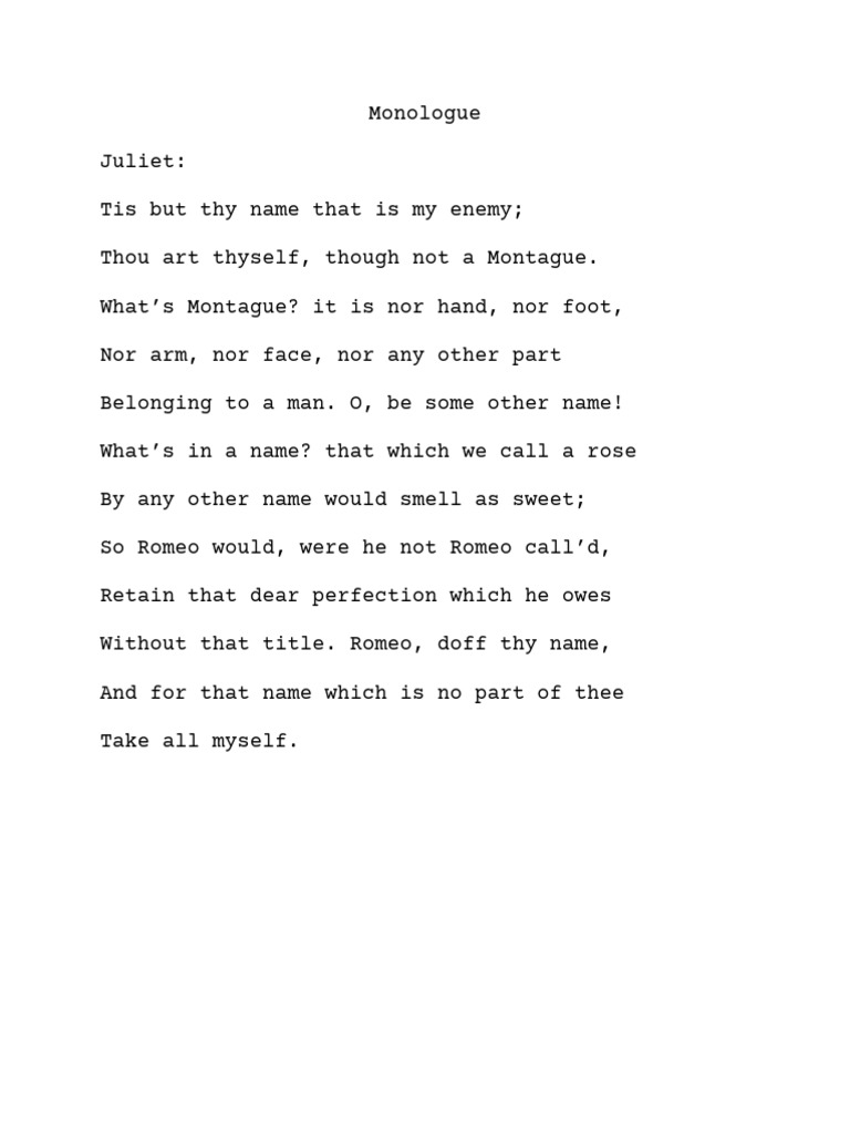 It is the east, and juliet is the sun! Each monologue entry includes the character's name, the first line of the speech, whether it is verse or prose, and shows the act, scene & line. What light through yonder window breaks? Within a dramatic play, an insightful monologue that conveys a character ’s inner feelings, viewpoints and thoughts are referred to as a.