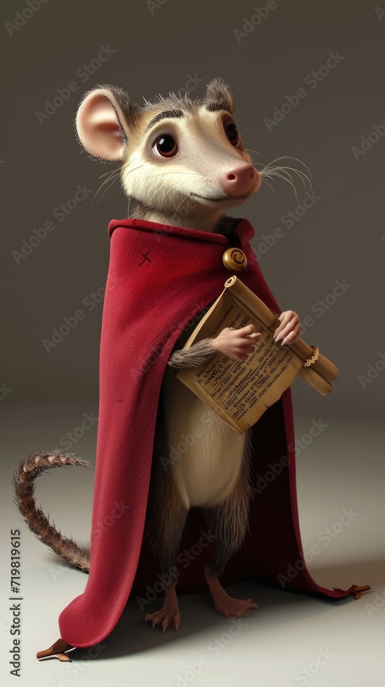 Cartoon digital avatar of a dramatic opossum actor, wearing a red