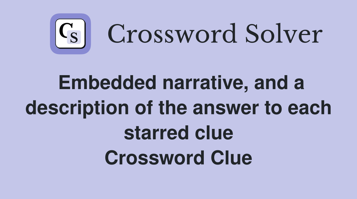 Here are the possible solutions for embedded narrative, and a description of the answer to each starred clue clue. On this page you will find the embedded narrative and a description of the answer to each starred clue crossword puzzle. It was last seen in the la. Answers for embedded narrative, and a description of the answer to each starred.