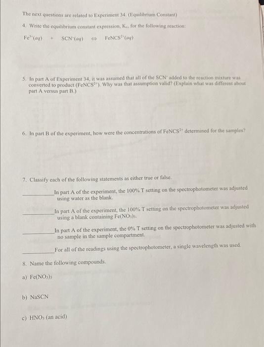 Solved Experiment 34 Prelaboratory Assignment An Equilibrium