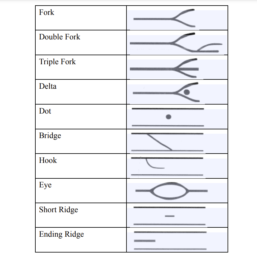 A Chart Illustrating Fingerprint Ridge Patterns (Arches, Loops And Whorls) And Fingerprint Ridge Characteristics (Core, Ending Ridge, Short Ridge,.