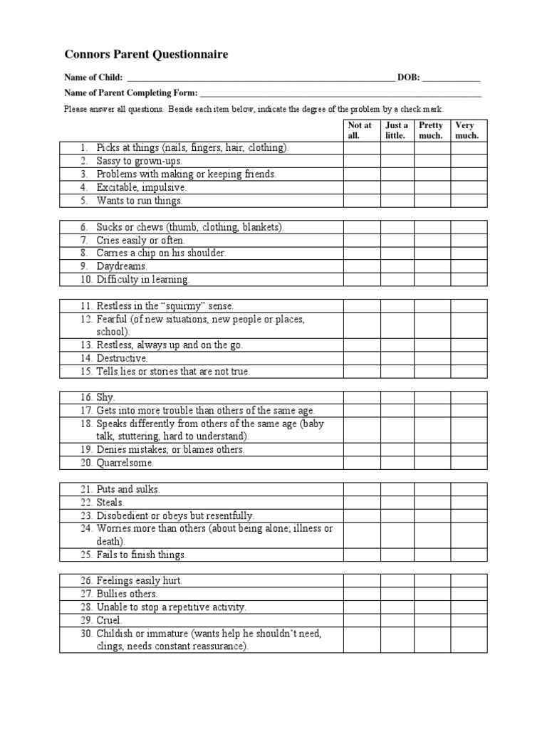 Check the appropriate box for each item (not at all, just a little, pretty much, or very much) which best describes your assessment of the child. These rating scales should not be used alone to obtain a diagnosis; Conners' teacher rating by c. Useful in entire process of defining the problem, eliciting further. For each itern, ask yourself how much of a problem has this been in the last month? and circle the best answer for each one. If none, not at all, seldom, or.