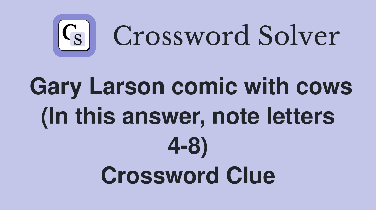 The crossword solver found 30 answers to gary larsen comic with cows, 10 letters crossword clue. Answers for gary larson comic with cows (in this answer, note letters 4 8) crossword clue, 10 letters. The crossword solver finds answers to classic. Search for crossword clues found in the daily. There are related clues (shown below).