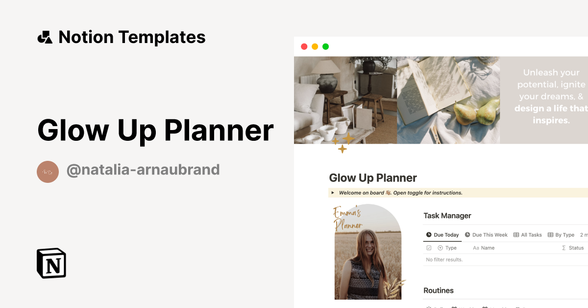 Glow Up Planner Template by Natalia Arnau Brand Notion Marketplace