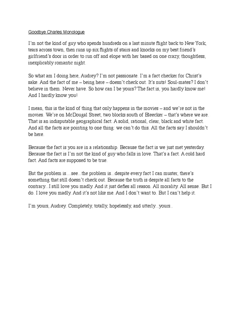 Goodbye Charles Monologue - A comedic female monologue from the play goodbye charles by gabriel davis. Comedic female monologue from the play goodbye charles by gabriel davis (monologist stands in front of her soon to be ex. Selected monologues from goodbye charles including video examples, context and character information. I ate the divorce papers. A woman tries to save her marriage by eating the divorce papers in this hilarious monologue from the play goodbye charles by gabriel davis. Learn with flashcards, games, and more — for free. 2 minute monologues, monologues for women, contemporary monologues, monologues from plays, comedic.