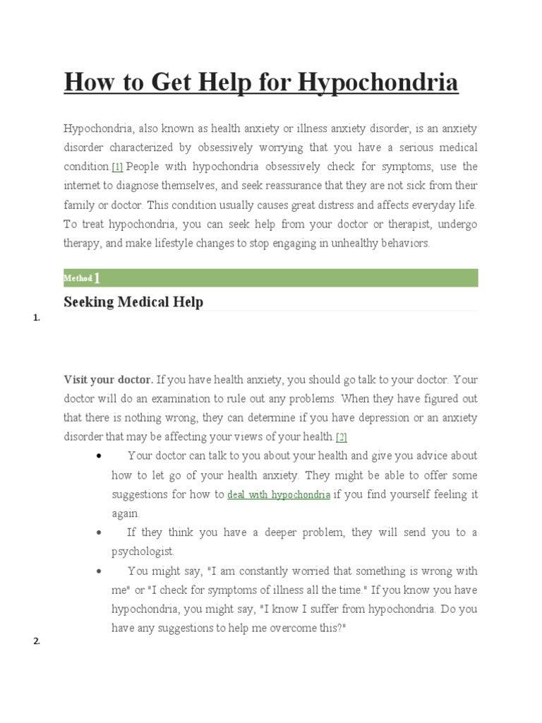 Somatic symptom disorder and illness anxiety disorder, which may be referred to by the outdated term “hypochondria,” can cause. Hypochondriasis, which affects up to 5 percent of medical outpatients, is defined as a persistent fear or belief that one has a serious,. When it comes to treating hypochondria, cognitive behavioral therapy (cbt) is often hailed as the gold standard.