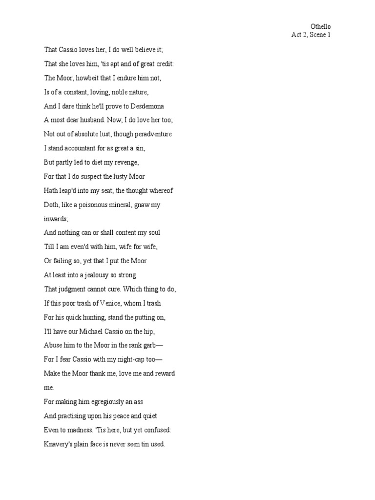 Learn about iago's monologues and soliloquies in ''othello'' by william shakespeare. I follow him to serve my turn upon him: In othello, the significance of iago's speech is that it reveals something about his character. We cannot all be masters, nor all masters cannot be truly. Three great ones of the city, in personal suit to make me his lieutenant,.