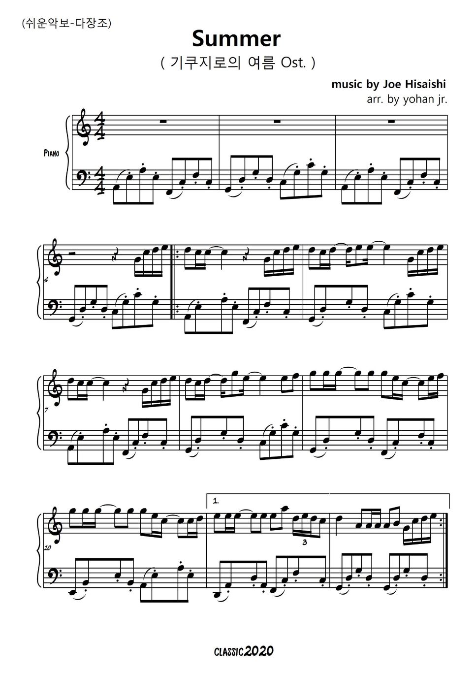 Joe Hisaishi Summer in C major (easy piano) 악보 by classic2020