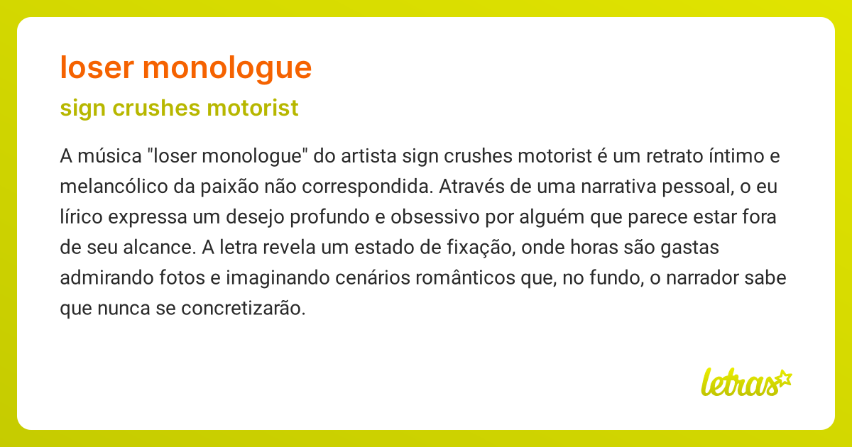 Loser Monologue Sign Crushes Motorist Lyrics - Find loser monologue lyrics, a song performed by sign crushes motorist : I stare at your pictures for hours on end dreaming, fantasizing about.