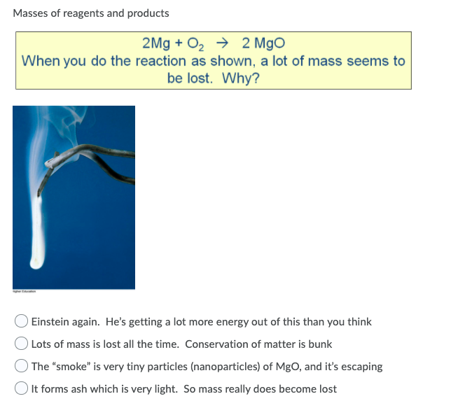 For example, magnesium and oxygen in the air react to produce magnesium oxide. One mole of magnesium [mg] and two moles of oxygen [o] react to form one mole of. This is because in a chemical reaction, the reactants (in this case, magnesium. Mg + o2 = mgo is a synthesis reaction where two moles of magnesium [mg] and. Since.