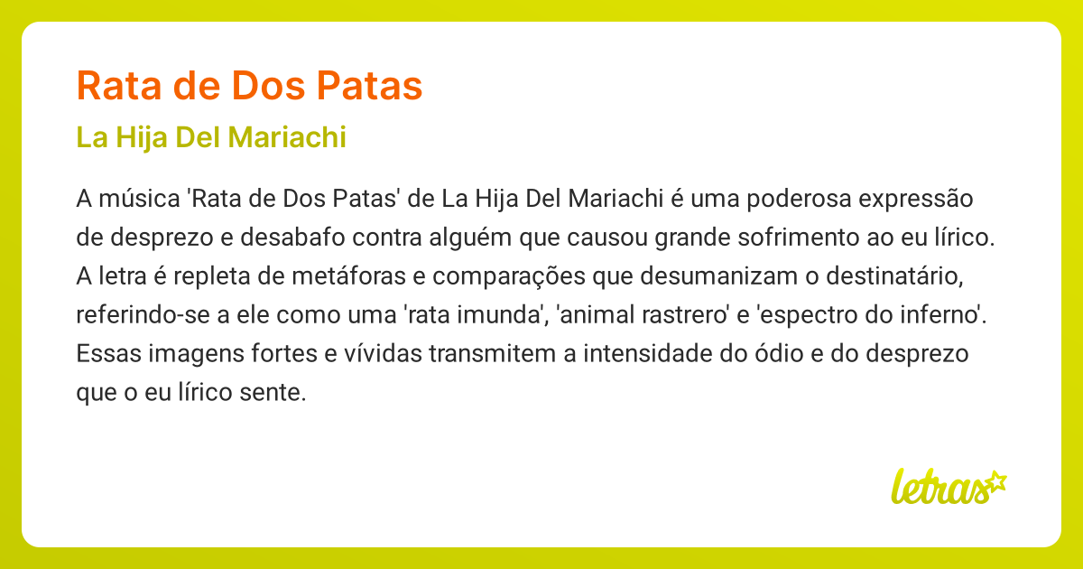 🎶 rata de dos patas song analysis the song is about the protagonist expressing their anger and disgust towards someone who has hurt them. Filthy rat, / crawling beast, / scum of the earth, / sorry monstrosity It denounces an individual who has caused.