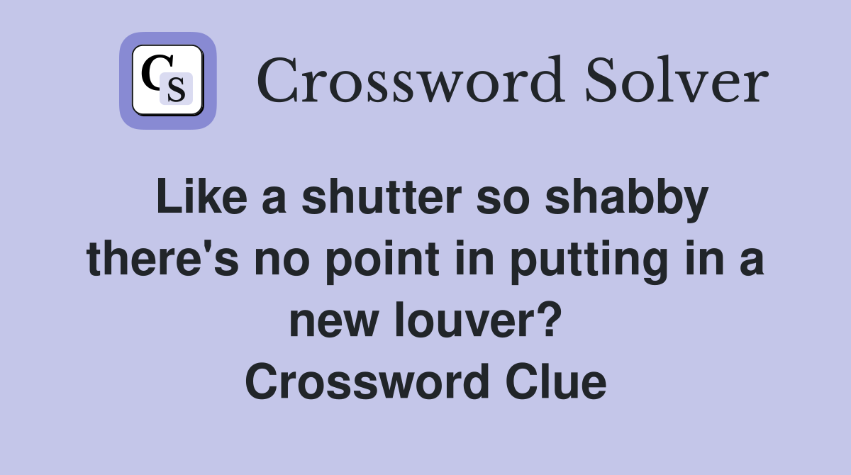 The crossword solver found 60 answers to shabby, 3 letters crossword clue. Find 18 possible solutions for the crossword puzzle clue shabby from the la times quick crossword. Learn the meaning and usage of. There are related clues (shown below). The crossword solver finds answers to classic crosswords and.