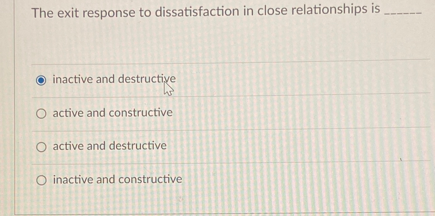 Response to dissatisfaction in close relationships: In rusbult's typology of responses to dissatisfaction in close relationships, a constructive and active response is _____,. The correct answer is d, when faced with. When people worry that their partners may leave them, people who are ________ nervously perceive dissension and difficulty where it does not exist. The exit response to dissatisfaction in.
