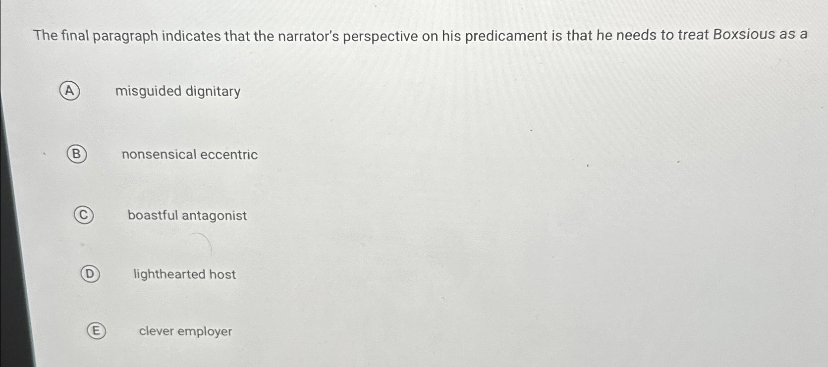 The final paragraph indicates that the narrators perspective on his predicament is that he needs to treat boxsious as a. The final paragraph indicates that the narrator’s perspective on his predicament is that he needs to treat boxsious as a. They guide the reader to anticipate a dramatic change in the narrator's. The final paragraph suggests that the narrator's perspective.