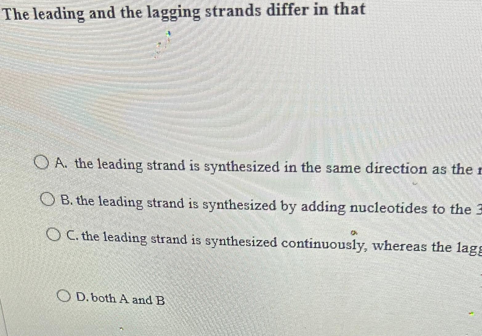 The Leading And The Lagging Strands Differ In That - The leading and the lagging strands differ in that a) the leading strand is synthesized in the same direction as the movement of the replication. The leading and the lagging strands differ in that a) the leading strand is synthesized in the same direction as the movement of the replication. The leading and the lagging strands differ in that the leading strand is synthesized in the same direction as the movement of the replication. Learn how dna replication forms a lagging and a leading strand, and how they differ in their direction, speed, fragments, and ligase. Dna polymerase can continuously synthesize the leading strand as it follows the unwinding of the dna helix.