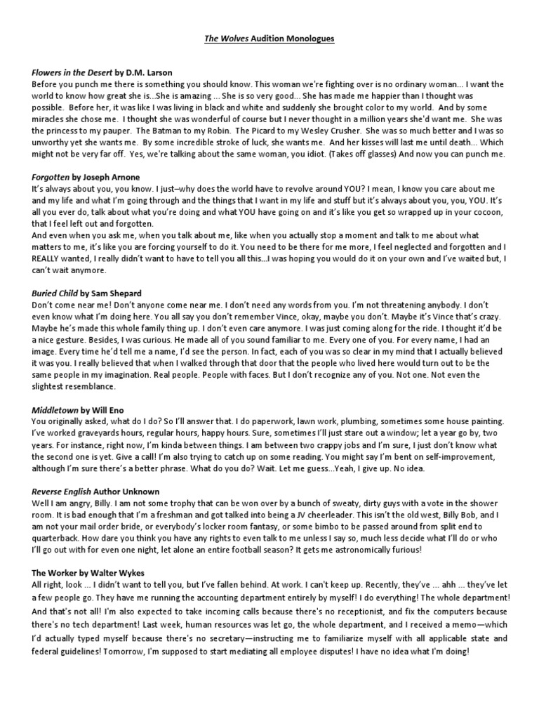Larson before you punch me there is something you should know. The wolves audition monologues flowers in the desert by d.m. #25's monologue from the wolves including context, text and video example. The document contains monologues from. I auditioned with a somewhat pieced together monologue from i and you by lauren gunderson (pm me if you want me to send.