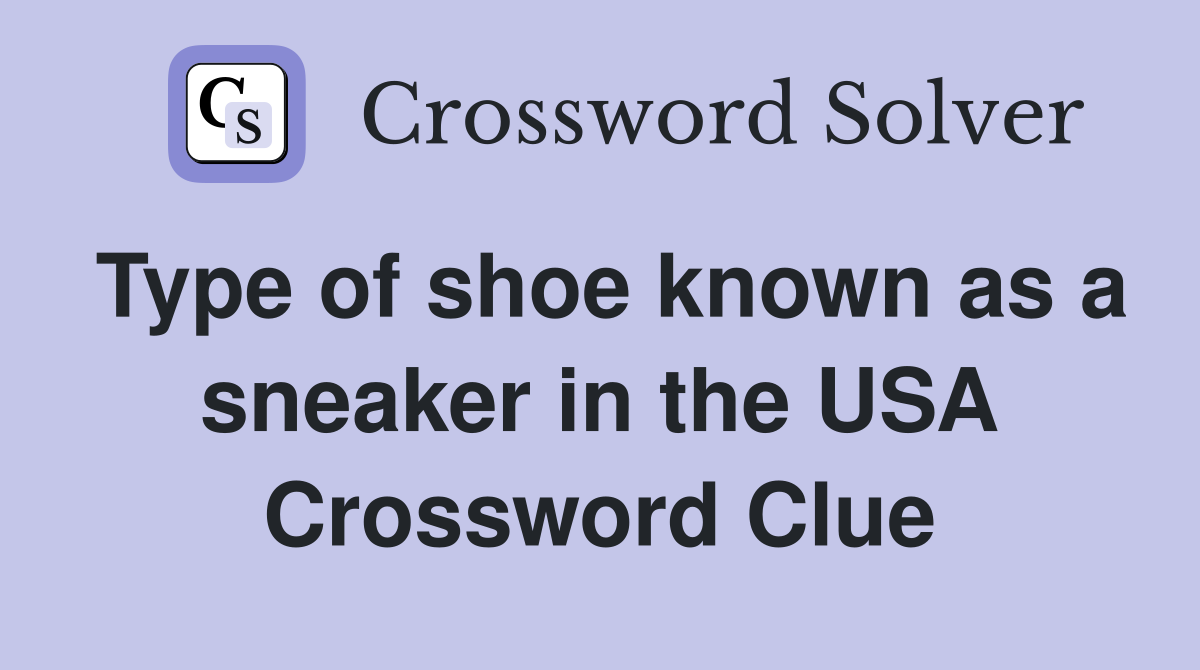 Here is the answer for the crossword clue type of shoe last seen in times concise puzzle. We have found 40 possible answers for this clue in our. All crossword answers with 5, 8 & 10 letters for type of shoe found in daily crossword puzzles: See synonyms, anagrams, and examples of type of shoe words. The crossword solver finds.