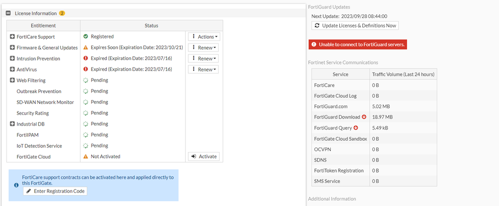 On the dashboard it say's no wan ip. Noticed that these two are showing as down in the gui: I thought it some global issue with fortinet public servers. I have two boxes on 7.2.3 and both say: The strange thing that i red arrow down to the web filtering and antispam p.s i'm using the 6.4.6 firmware with 100e.