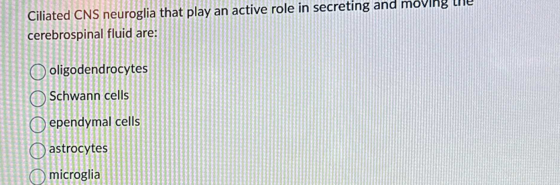 What are ciliated cns neuroglia that play an active role in moving the cerebrospinal fluid called? Study with quizlet and memorize flashcards containing terms like ciliated cns neuroglia that play an active role in moving the cerebrospinal. What are ciliated cns neuroglial cells that play an active role in moving the cerebrospinal fluid called? Here’s the best way to solve.