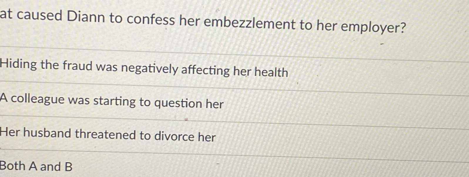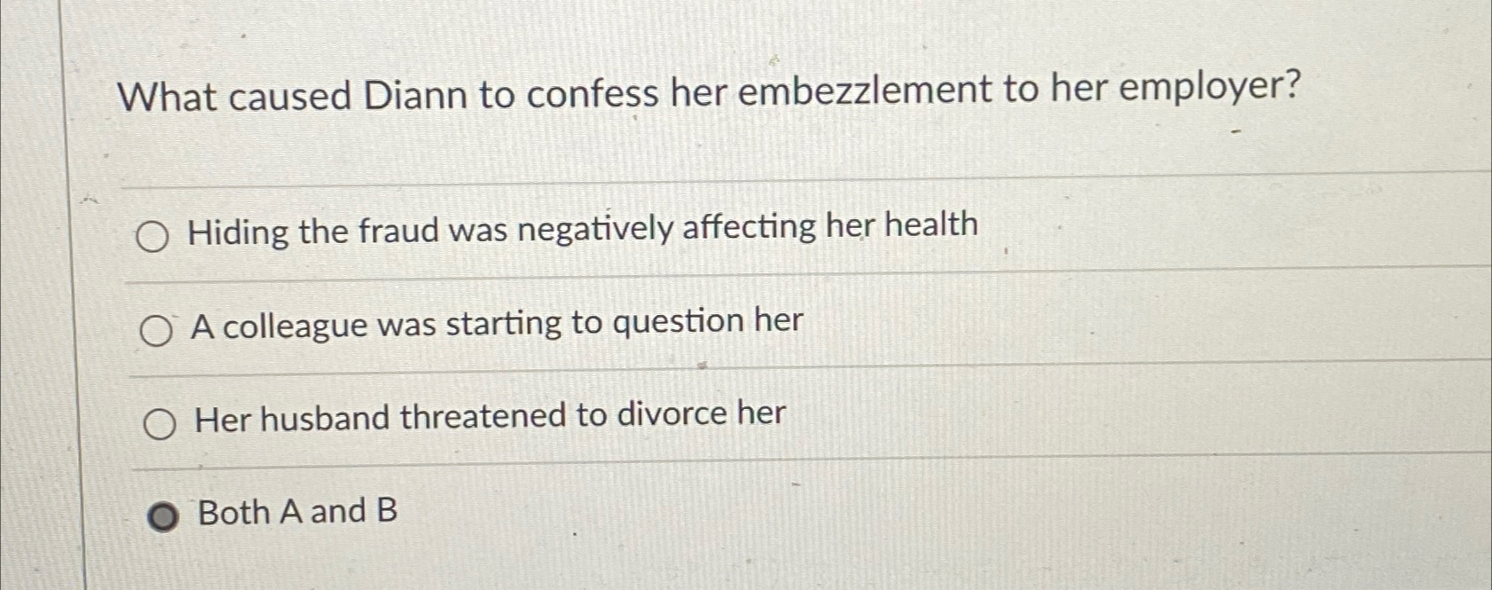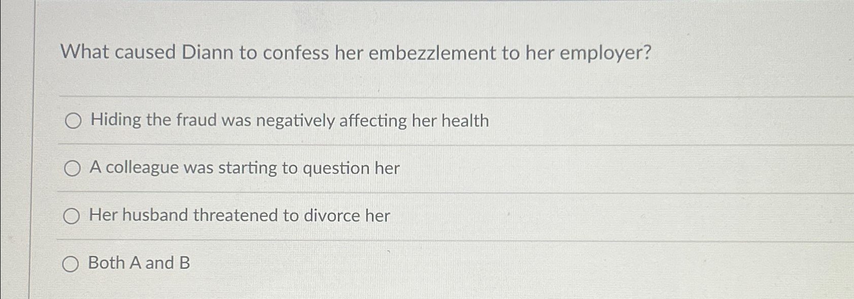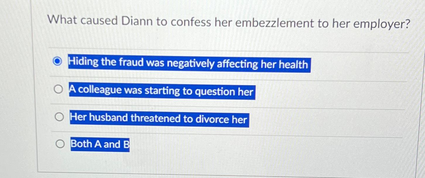 Diann confessed her embezzlement to her employer because hiding the fraud was damaging her health and a coworker began to. What was the initial spark the led diann to start defrauding her company? With the guilt of her crimes weighing on her conscience and affecting her health, diann ultimately confessed to the company's owners. When asked what triggered her to.