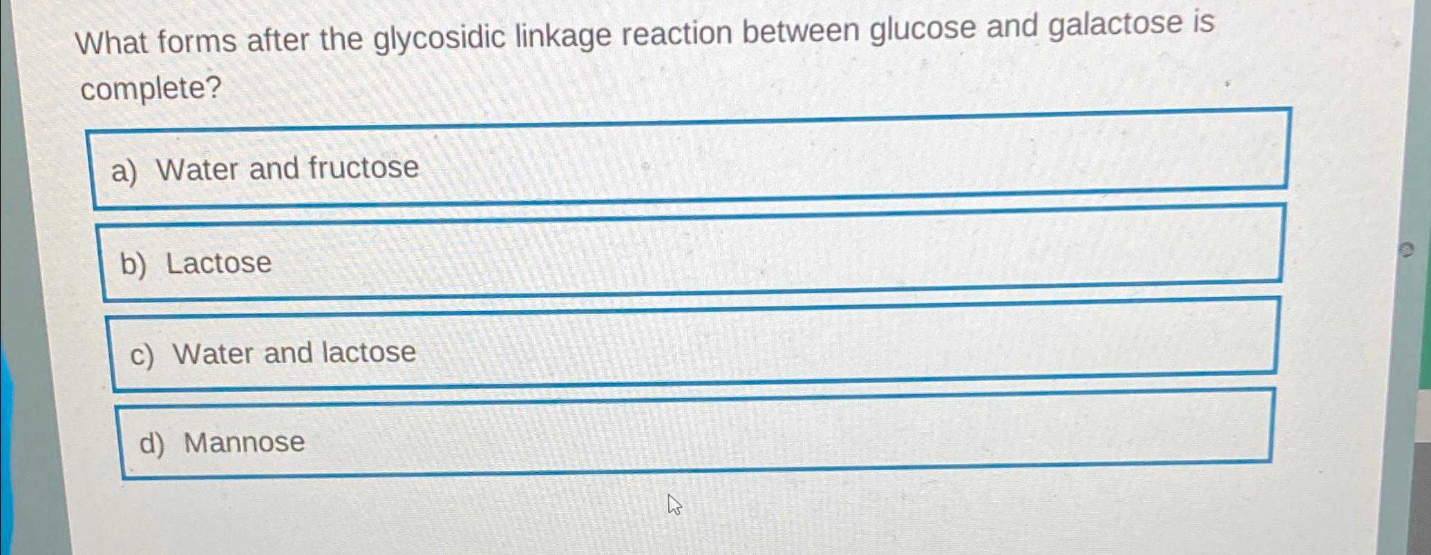When glucose and galactose undergo a glycosidic linkage reaction, they form the disaccharide lactose. What forms after the glycosidic linkage reaction between glucose and galactose is complete? Benedict's reagent detects the presence of. Water and lactose benedict's reagent detects. What forms after the glycosidic linkage reaction between glucose and galactose is complete?