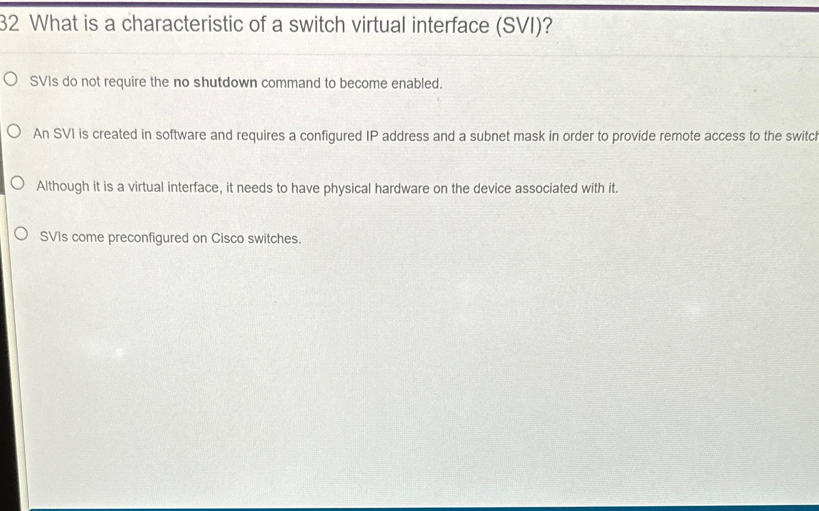 Layer 2 switches use svis for remote management. These are virtual interfaces because there is no physical hardware on the device associated with it. Switch virtual interfaces (svis) are virtual and have no physical port. An svi is created in software. An svi is operational if one of the switch interfaces is associated with any vlan.