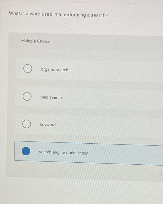 The question asks for a word commonly used in the context of performing a search keyword refers to specific words or phrases that users input into a. What measures the number of people a firm can communicate with all over the world? What is a word used in a performing a search? To perform a search, you'll need to navigate.