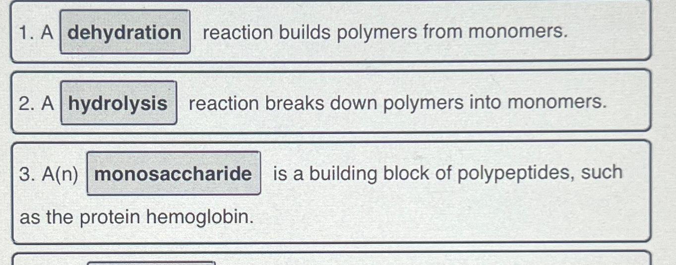 Study with quizlet and memorize flashcards containing terms like a dehydration reaction builds polymers from monomers., a hydrolysis reaction. The monomers combine with each other using covalent bonds to form larger molecules known as polymers. The monomers combine with each other via. In doing so, monomers release water.